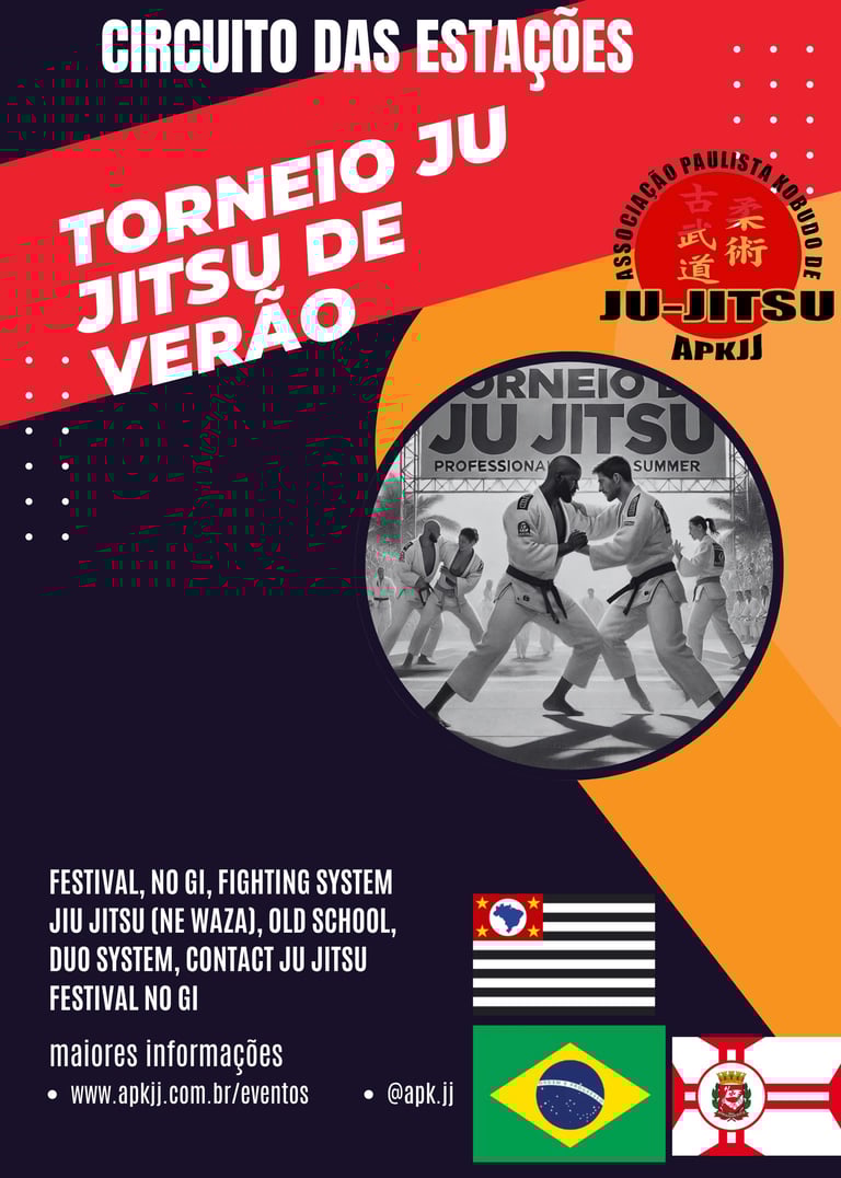 Participe de mais uma ciclo do Circuito das Estações - Torneio de Verão de Ju Jitsu 2025, promovido pela Associação Paulista Kobudo de Ju Jitsu. Um evento que reúne diversos atletas, com o objetivo de promover a modalidade e descobrir novos talentos, colocar em prática o que aprendeu com seu professor. Será Durante o Verão Entre Fevereiro e Março.