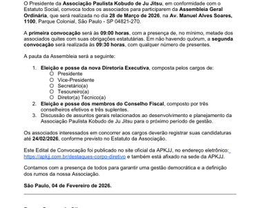 O presidente de uma instituição como a Associação Paulista Kobudo de Ju Jitsu (APKJJ) tem o papel central de liderar, representar e inspirar. Cabe a ele definir diretrizes estratégicas, promover a expansão do esporte, zelar pela credibilidade e garantir que cada decisão esteja alinhada à missão da associação. Deve fortalecer parcerias, buscar recursos, assegurar a transparência administrativa e unir diretoria, professores e atletas em torno de um mesmo propósito. O presidente não apenas administra: ele abre caminhos para o futuro, impulsiona projetos e consolida o legado da entidade.