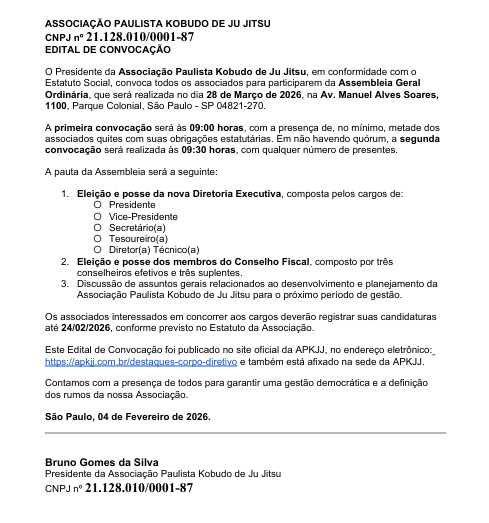 O Corpo Diretivo da Associação Paulista Kobudo de Ju Jitsu (APKJJ) é formado por pessoas comprometidas com o desenvolvimento do esporte em suas dimensões social, educacional e competitiva. Cada membro tem papel essencial: a presidência conduz a visão estratégica; a vice-presidência apoia e garante continuidade; a tesouraria assegura transparência e gestão responsável dos recursos; a secretaria organiza e registra as ações; e o conselho fiscal fiscaliza e dá credibilidade às decisões. Unidos, trabalham para fortalecer o Ju Jitsu, formar atletas e impactar positivamente a sociedade.